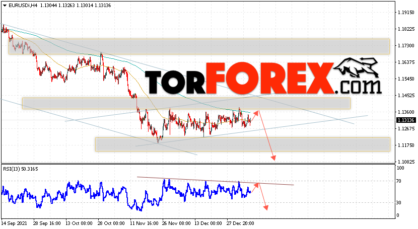 Таким образом, EUR/USD прогноз Евро Доллар на 7 января 2022 предполагает развитие небольшой бычьей коррекции и тест области сопротивления вблизи уровня 1.1360. Откуда стоит рассматривать отскок цены вниз и попытку продолжения падения валютной пары на рынке в область ниже уровня 1.1085. В пользу снижения инструмента на рынке Форекс выступит тест нисходящей линии тренда на индикаторе относительной силы (RSI). Отменой варианта падения пары EUR/USD станет сильный рост котировок и пробой уровня 1.1475. Это укажет на пробой области сопротивления и продолжение подъёма валютной пары на Форекс в область выше уровня 1.1695.