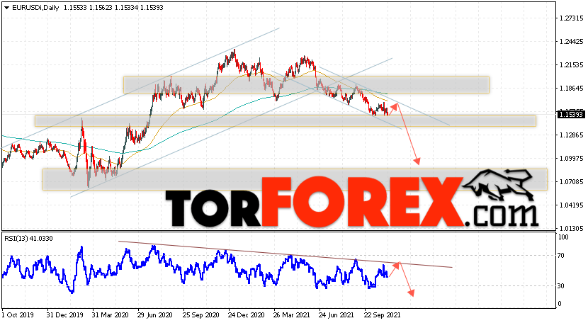 Дополнительным сигналом в пользу падения валютной пары EUR/USD на Форекс выступит тест нисходящей линии тренда на индикаторе относительной силы. Вторым сигналом станет отскок от верхней границы нисходящего канала. Отменой варианта снижения котировок пары Евро Доллар на текущей торговой неделе 8 — 12 ноября 2021, станет сильный рост и пробой уровня 1.1875. Это укажет на пробой области сопротивления и продолжение роста пары в область выше уровня 1.2425. С пробоем области поддержки и закрытием котировок ниже уровня 1.1275 стоит ожидать подтверждения снижения. Что также укажет на пробой нижней границы нисходящего канала, а это сигнал к ускорению движения вниз.