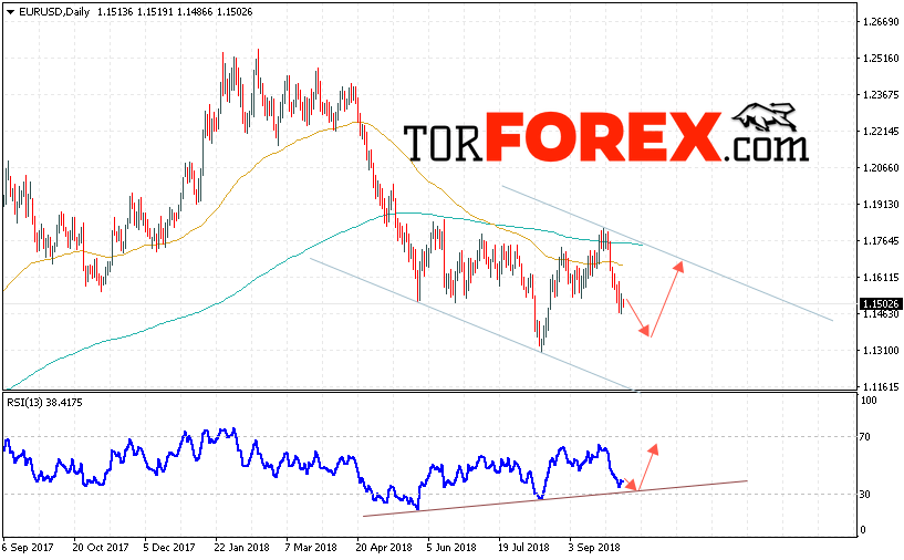 В пользу роста валютной пары EUR/USD на Форекс выступит тест линии тренда на индикаторе относительной силы. Отменой варианта роста котировок пары на текущей торговой неделе 8 — 12 октября 2018 станет падение и пробой уровня 1.1280, что укажет на пробой области поддержки и продолжения снижения пары в область ниже уровня 1.1050. С пробоем верхней границы канала и закрытием котировок выше уровня 1.1720 стоит ожидать подтверждения развития восходящей тенденции по паре.