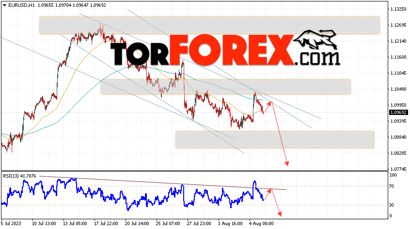 Таким образом, EUR/USD прогноз Евро Доллар на 8 августа 2023 предполагает попытку развития подъёма пары и тест области сопротивления вблизи уровня 1.0995. Откуда стоит рассматривать отскок цены вниз и попытку продолжения падения валютной пары на рынке в область ниже уровня 1.0765. Дополнительным сигналом в пользу падения инструмента на рынке Форекс выступит тест линии тренда на индикаторе относительной силы (RSI). Отменой варианта со снижением пары EUR/USD станет сильный рост котировок и пробой уровня 1.1065. Это укажет на пробой области сопротивления и продолжение роста валютной пары на Форекс в область выше уровня 1.1275.