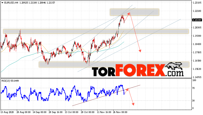 Таким образом, EUR/USD прогноз Евро Доллар на 8 декабря 2020 предполагает развитие коррекции и тест области сопротивления вблизи уровня 1.2175. Откуда стоит ожидать отскок и попытку продолжения падения пары в область ниже уровня 1.1765. В пользу снижения валютной пары выступит тест линии тренда на индикаторе относительной силы. Отменой варианта падения пары EUR/USD станет сильный рост котировок и пробой уровня 1.2265. Это укажет на пробой области сопротивления и продолжение роста валютной пары на Форекс в область выше уровня 1.2525.