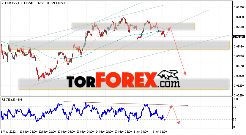 Таким образом, EUR/USD прогноз Евро Доллар на 8 июня 2022 предполагает попытку развития бычьей коррекции и тест области сопротивления вблизи уровня 1.0715. Откуда стоит рассматривать отскок цены вниз и попытку продолжения падения валютной пары на рынке в область ниже уровня 1.0385. В пользу снижения инструмента на рынке Форекс выступит тест нисходящей линии тренда на индикаторе относительной силы (RSI). Отменой варианта падения пары EUR/USD станет сильный рост котировок и пробой уровня 1.0835. Это укажет на пробой области сопротивления и продолжение подъёма валютной пары на Форекс в область выше уровня 1.1095.