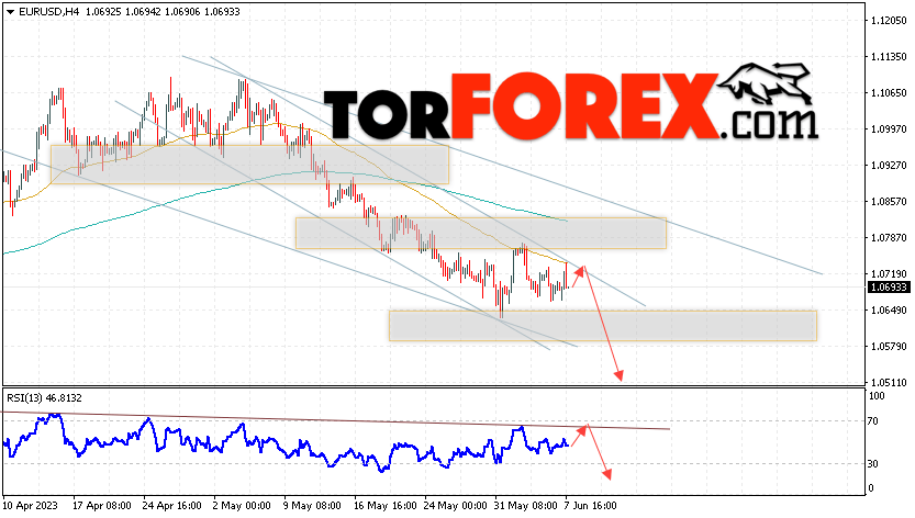 Таким образом, EUR/USD прогноз Евро Доллар на 8 июня 2023 предполагает попытку развития незначительной бычьей коррекции пары и тест области сопротивления вблизи уровня 1.0720. Откуда стоит рассматривать отскок цены вниз и попытку падения валютной пары на рынке в область ниже уровня 1.0515. Дополнительным сигналом в пользу снижения инструмента на рынке Форекс выступит тест линии тренда на индикаторе относительной силы (RSI). Отменой варианта с падением пары EUR/USD станет сильный рост котировок и пробой уровня 1.0825. Это укажет на пробой области сопротивления и продолжение роста валютной пары на Форекс в область выше уровня 1.0975.