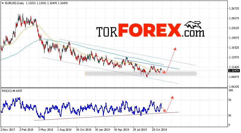 Таким образом, EUR/USD прогноз Евро Доллар 9 — 13 декабря 2019 предполагает попытку теста области поддержки вблизи уровня 1.1005. Откуда стоит ожидать продолжения роста пары в область выше уровня 1.1655. Дополнительным сигналом в пользу роста выступит тест линии поддержки на индикаторе относительной силы. Отменой варианта роста евро доллар станет падение и пробой уровня 1.0845. В этом случае стоит ожидать продолжения снижения пары с потенциальной целью на уровне 1.0405.
