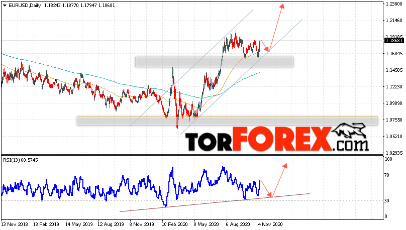 Дополнительным сигналом в пользу подъёма валютной пары EUR/USD на Форекс выступит тест линии поддержки на индикаторе относительной силы. Вторым сигналом станет отскок от нижней границы восходящего канала. Отменой варианта роста котировок пары Евро Доллар на текущей торговой неделю 9 — 13 ноября 2020, станет падение и пробой уровня 1.1465. Это укажет на пробой области поддержки и продолжения падения пары в область ниже уровня 1.1025. С пробоем области сопротивления и закрытием котировок выше уровня 1.1995.