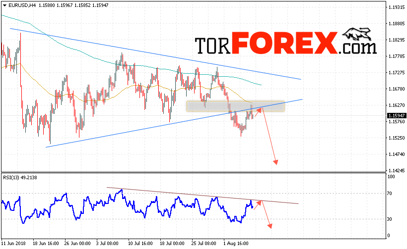 Таким образом, EUR/USD прогноз Евро Доллар на 9 августа 2018 предполагает попытку теста области сопротивления вблизи уровня 1.1620, откуда стоит ожидать отскок и попытку продолжения падения пары в область ниже уровня 1.1425, в пользу снижения выступит тест линии тренда на индикаторе относительной силы, отменой варианта падения EUR/USD станет сильный рост и пробой уровня 1.1665, что укажет на пробой области сопротивления и продолжение роста пары в область выше уровня 1.1720.