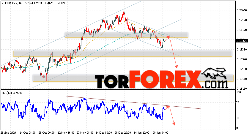 Дополнительным сигналом в пользу снижения котировок EUR/USD выступит тест нисходящей линии тренда на индикаторе относительной силы (RSI). Вторым сигналом станет отскок от верхней границы нисходящего канала. Отменой варианта снижения котировок валютной пары Евро Доллар станет сильный рост и пробой уровня 1.2135. Это укажет на пробой области сопротивления и продолжение подъёма в область на уровне 1.2265. Ожидать подтверждения падения по валютной паре EUR/USD стоит с пробоем области поддержки и закрытием цен ниже уровня 1.1905.