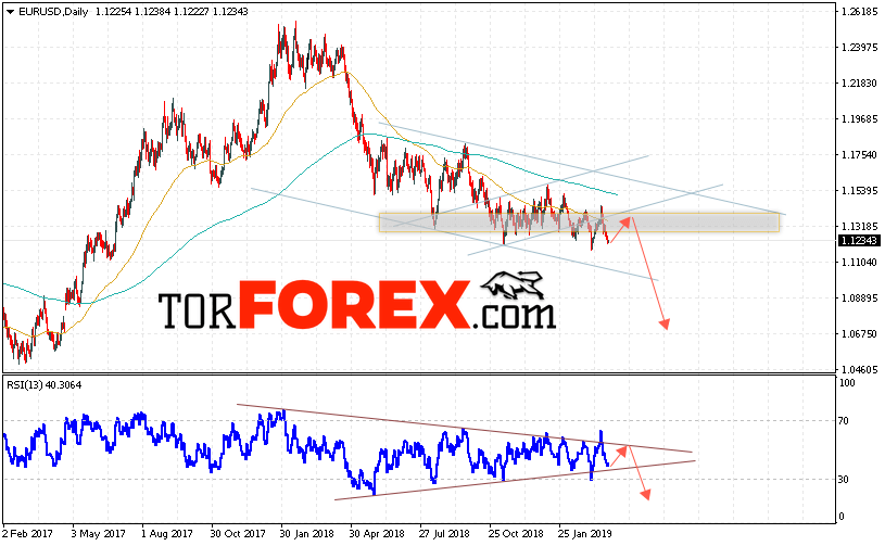 Таким образом, EUR/USD прогноз Евро Доллар на неделю 1 — 5 апреля 2019 предполагает попытку теста области сопротивления вблизи уровня 1.1335. Откуда стоит ожидать продолжения падения пары в область ниже уровня 1.0675. В пользу падения выступит тест линии тренда на индикаторе относительной силы. Отменой варианта снижения евро доллар станет сильный рост и пробой уровня 1.1545. В этом случае стоит ожидать продолжения роста пары с потенциальной целью на уровне 1.1750.