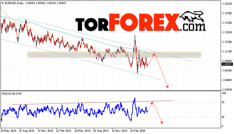 В пользу падения валютной пары EUR/USD на Форекс выступит тест линии сопротивления на индикаторе относительной силы. Вторым сигналом станет отскок от верхней границы нисходящего канала. Отменой варианта падения котировок пары Евро Доллар на текущей торговой неделе 11 — 15 мая 2020, станет сильный рост и пробой уровня 1.1255. Это укажет на пробой области сопротивления и продолжения роста пары в область выше уровня 1.1575. С пробоем области поддержки и закрытием котировок ниже уровня 1.0645 стоит ожидать подтверждения развития медвежьего движения по паре.