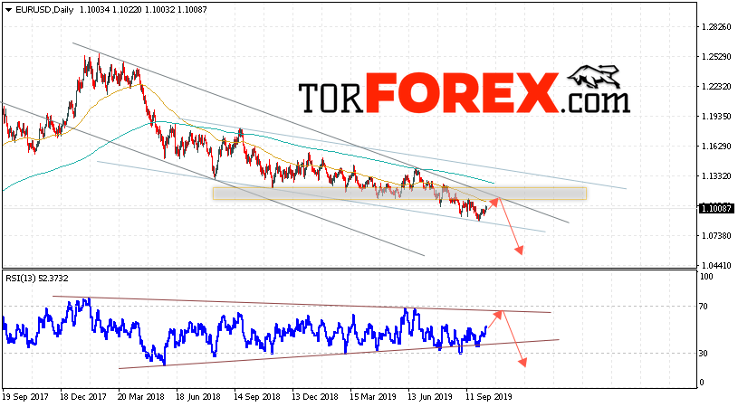 Таким образом, EUR/USD прогноз Евро Доллар неделю 14 — 18 октября 2019 предполагает попытку теста области сопротивления вблизи уровня 1.1145. Откуда стоит ожидать продолжения падения пары в область ниже уровня 1.0585. В пользу падения выступит тест линии тренда на индикаторе относительной силы. Отменой варианта снижения евро доллар станет сильный рост и пробой уровня 1.1295. В этом случае стоит ожидать продолжения роста пары с потенциальной целью на уровне 1.1685.