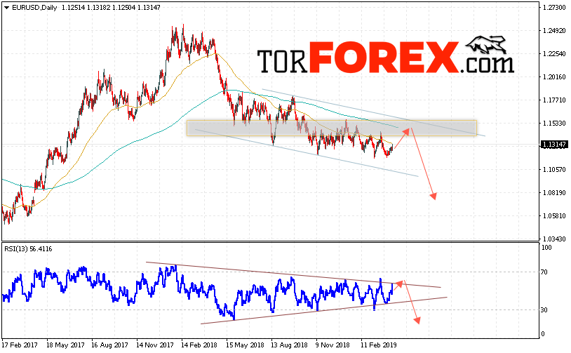 Таким образом, EUR/USD прогноз Евро Доллар на неделю 15 — 19 апреля 2019 предполагает попытку теста области сопротивления вблизи уровня 1.1385. Откуда стоит ожидать продолжения падения пары в область ниже уровня 1.0765. В пользу падения выступит тест линии тренда на индикаторе относительной силы. Отменой варианта снижения евро доллар станет сильный рост и пробой уровня 1.1565. В этом случае стоит ожидать продолжения роста пары с потенциальной целью на уровне 1.1785.