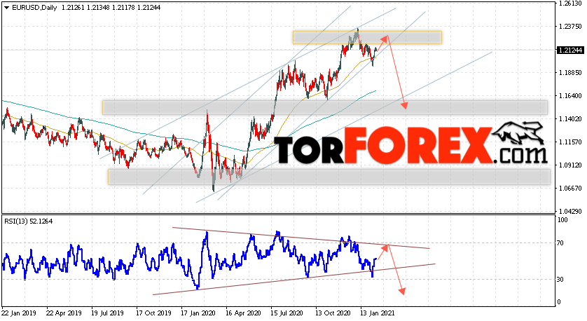 Дополнительным сигналом в пользу падения валютной пары EUR/USD на Форекс выступит тест пробитой линии тренда на индикаторе относительной силы. Вторым сигналом станет отскок от нижней границы восходящего канала. Отменой варианта падения котировок пары Евро Доллар на текущей торговой неделю 15 — 19 февраля 2021, станет сильный рост и пробой уровня 1.2395. Это укажет на пробой области сопротивления и продолжения роста пары в область выше уровня 1.2685. С пробоем области поддержки и закрытием котировок ниже уровня 1.1865.
