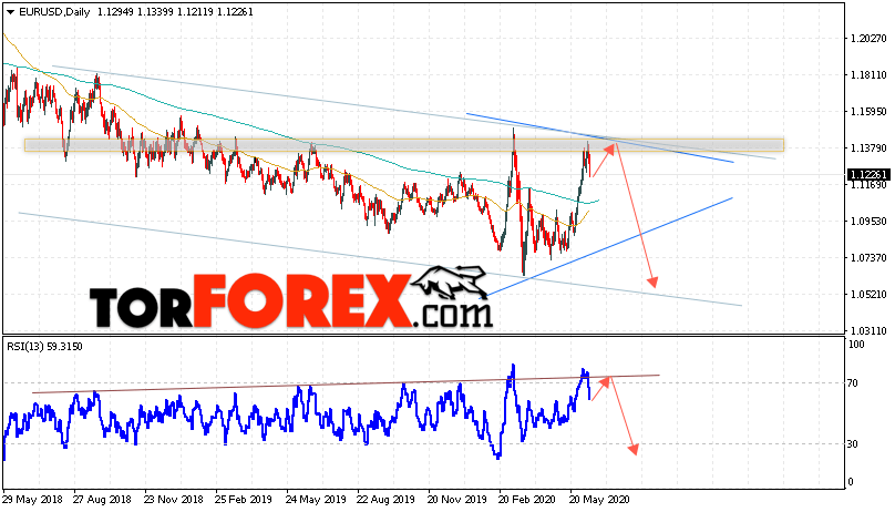 В пользу падения валютной пары EUR/USD на Форекс выступит тест линии сопротивления на индикаторе относительной силы. Вторым сигналом станет отскок от верхней границы нисходящего канала. Отменой варианта падения котировок пары Евро Доллар на текущей торговой неделе 15 — 19 июня 2020, станет сильный рост и пробой уровня 1.1565. Это укажет на пробой области сопротивления и продолжения роста пары в область выше уровня 1.1945. С пробоем области поддержки и закрытием котировок ниже уровня 1.1125 стоит ожидать подтверждения развития медвежьего движения по паре.