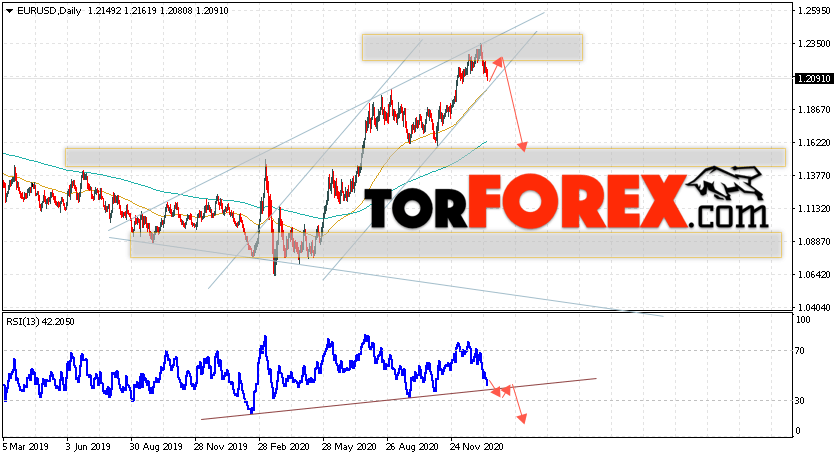 Дополнительным сигналом в пользу падения валютной пары EUR/USD на Форекс выступит тест линии сопротивления на индикаторе относительной силы. Вторым сигналом станет отскок от верхней границы восходящего канала. Отменой варианта падения котировок пары Евро Доллар на текущей торговой неделю 18 — 22 января 2021, станет сильный рост и пробой уровня 1.2405. Это укажет на пробой области сопротивления и продолжения роста пары в область выше уровня 1.2705. С пробоем области поддержки и закрытием котировок ниже уровня 1.1955.