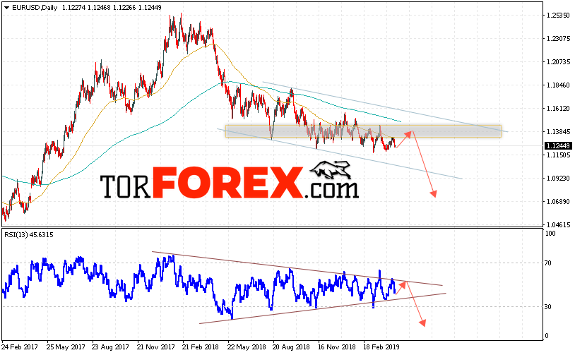 В пользу падения валютной пары EUR/USD на Форекс выступит тест нисходящей линии тренда на индикаторе относительной силы. Вторым сигналом может стать отскок от верхней границы нисходящего канала. Отменой варианта падения котировок пары Евро Доллар на текущей торговой неделе на 22 — 26 апреля 2019. Станет сильный рост и пробой уровня 1.1565. Это укажет на пробой верхней границы нисходящего канала и продолжения роста пары в область выше уровня 1.1785. С пробоем области поддержки и закрытием котировок ниже уровня 1.1135 стоит ожидать подтверждения развития нисходящего тренда по паре.