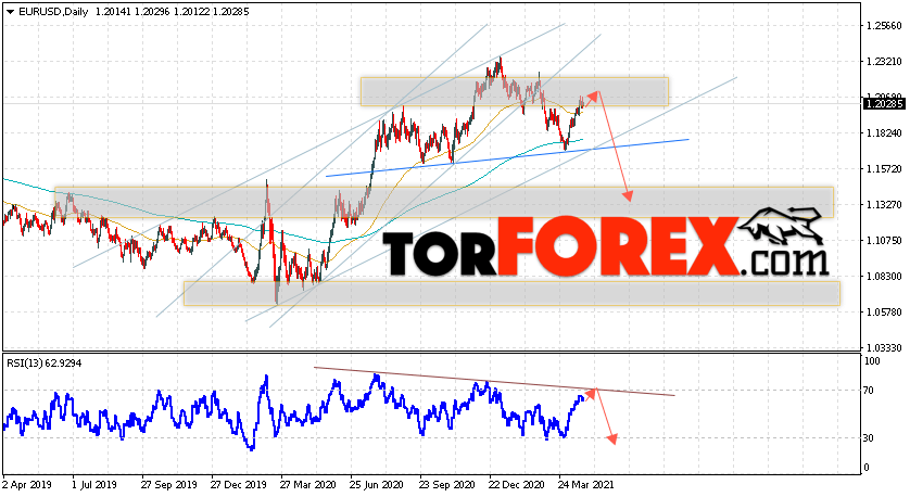 Таким образом, EUR/USD прогноз Евро Доллар на неделю 26 — 30 апреля 2021 предполагает попытку коррекции и теста области сопротивления вблизи уровня 1.2105. Откуда стоит ожидать продолжения падения пары в область ниже уровня 1.1325. Дополнительным сигналом в пользу снижения выступит тест линии сопротивления на индикаторе относительной силы. Отменой варианта падения Евро Доллар станет сильный рост и пробой уровня 1.2365. В этом случае стоит ожидать продолжения подъёма пары с потенциальной целью на уровне 1.2755.
