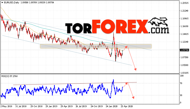 В пользу падения валютной пары EUR/USD на Форекс выступит тест линии сопротивления на индикаторе относительной силы. Вторым сигналом станет отскок от верхней границы нисходящего канала. Отменой варианта падения котировок пары Евро Доллар на текущей торговой неделе 4 — 8 мая 2020, станет сильный рост и пробой уровня 1.1245. Это укажет на пробой области сопротивления и продолжения роста пары в область выше уровня 1.1545. С пробоем области поддержки и закрытием котировок ниже уровня 1.0635 стоит ожидать подтверждения развития медвежьего движения по паре.