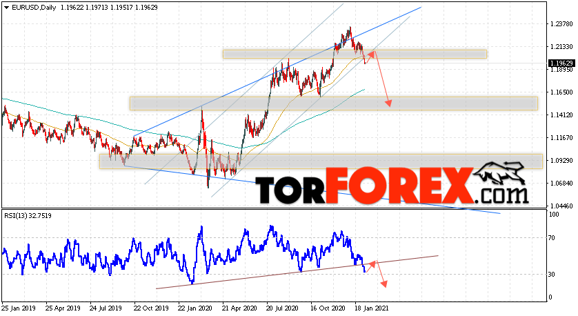 Дополнительным сигналом в пользу падения валютной пары EUR/USD на Форекс выступит тест пробитой линии тренда на индикаторе относительной силы. Вторым сигналом станет отскок от нижней границы восходящего канала. Отменой варианта падения котировок пары Евро Доллар на текущей торговой неделю 8 — 12 февраля 2021, станет сильный рост и пробой уровня 1.2355. Это укажет на пробой области сопротивления и продолжения роста пары в область выше уровня 1.2675. С пробоем области поддержки и закрытием котировок ниже уровня 1.1805.