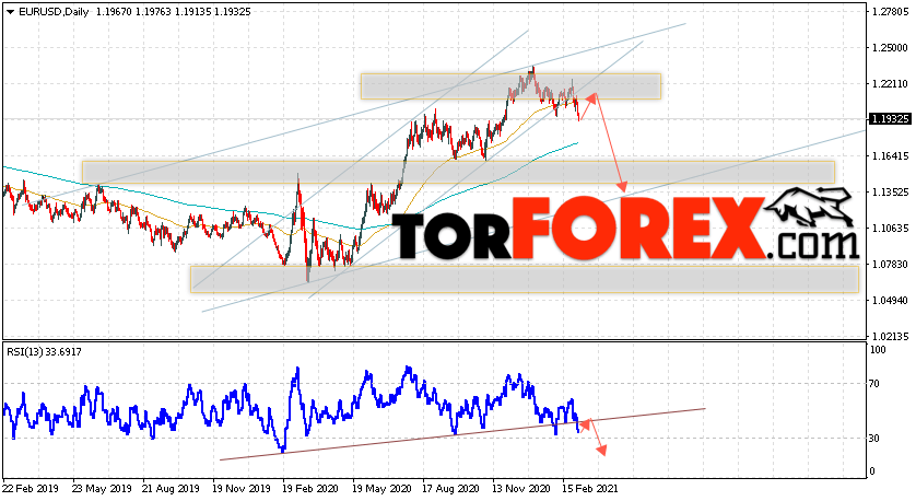 Таким образом, EUR/USD прогноз Евро Доллар на неделю 8 — 12 марта 2021 предполагает попытку коррекции и теста области сопротивления вблизи уровня 1.1995. Откуда стоит ожидать продолжения падения пары в область ниже уровня 1.1355. Дополнительным сигналом в пользу снижения выступит тест линии сопротивления на индикаторе относительной силы. Отменой варианта падения Евро Доллар станет сильный рост и пробой уровня 1.2490. В этом случае стоит ожидать продолжения подъёма пары с потенциальной целью на уровне 1.2865.