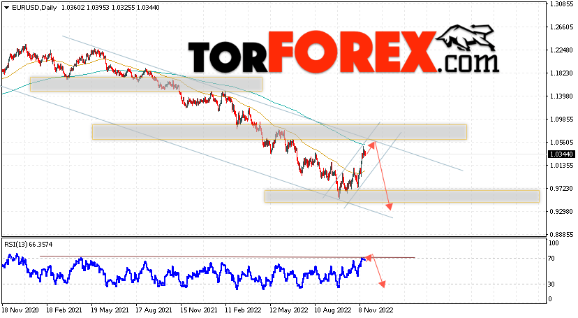 Дополнительным сигналом в пользу роста валютной пары EUR/USD на Форекс выступит тест линии тренда на индикаторе относительной силы (RSI), которая была пробита покупателями вверх. Вторым сигналом станет отскок от верхней границы медвежьего канала. Отменой варианта падения котировок пары Евро Доллар на текущей торговой неделе 21 — 25 ноября 2022, станет сильный рост и пробой уровня 1.0745. Это укажет на пробой области поддержки и продолжение падения пары в область ниже уровня 1.1165. С пробоем области сопротивления и закрытием котировок выше уровня 1.0055 стоит ожидать подтверждения подъёма по паре, что укажет на пробой нижней границы бычьего канала коррекции.