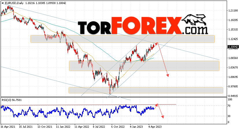 Дополнительным сигналом в пользу снижения валютной пары EUR/USD на Форекс выступит тест линии тренда на индикаторе относительной силы (RSI). Вторым сигналом станет отскок от верхней границы нисходящего канала. Отменой варианта падения котировок пары Евро Доллар на текущей торговой неделе 1 — 5 мая 2023, станет сильный рост и пробой уровня 1.1355. Это укажет на пробой области сопротивления и продолжение роста пары в область выше уровня 1.1695. С пробоем области поддержки и закрытием котировок ниже уровня 1.0725, что укажет на пробой нижней границы бычьего канала коррекции и начало отработки модели «Двойная вершина» с целями внизу.