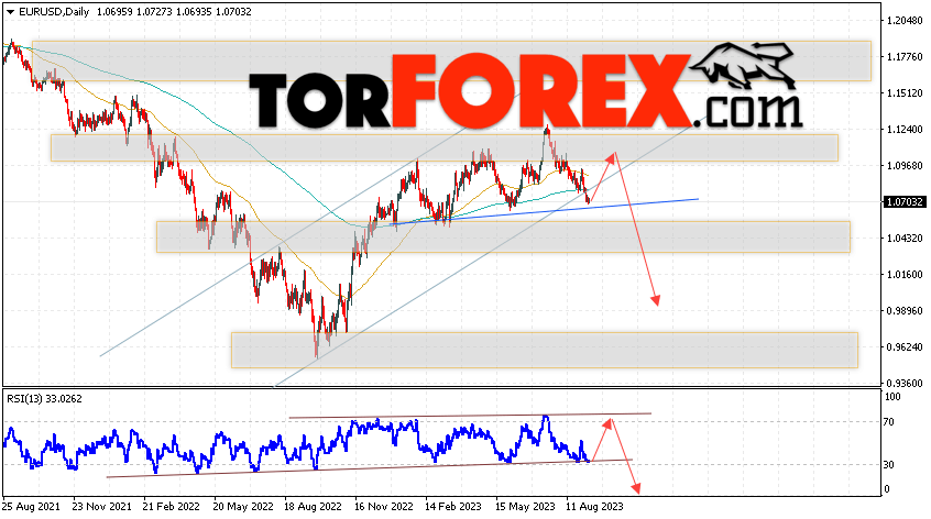 Дополнительным сигналом в пользу снижения валютной пары EUR/USD на Форекс выступит тест линии сопротивления на индикаторе относительной силы (RSI). Вторым сигналом станет отскок от нижней границы бычьего канала, которым был пробит медведями вниз. Отменой варианта падения котировок пары Евро Доллар на текущей торговой неделе 11 — 15 сентября 2023, станет сильный рост и пробой уровня 1.1275. Это укажет на пробой области сопротивления и продолжение роста пары в область выше уровня 1.1535. С пробоем области поддержки и закрытием котировок ниже уровня 1.0685, что укажет на пробой нижней границы разворотной модели «Голова и плечи» и начало отработки паттерна с целями внизу.