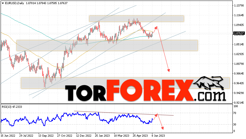 Дополнительным сигналом в пользу снижения валютной пары EUR/USD на Форекс выступит тест линии сопротивления на индикаторе относительной силы (RSI), пока же значения отталкиваются от области поддержки на графике индикаторе RSI, поэтому сохраняется высокая вероятность развития сильной бычьей коррекции перед падением. Вторым сигналом станет отскок от нижней границы бычьего канала, который был пробит вниз продавцами. Отменой варианта падения котировок пары Евро Доллар на текущей торговой неделе 12 — 16 июня 2023, станет сильный рост и пробой уровня 1.1265. Это укажет на пробой области сопротивления и продолжение роста пары в область выше уровня 1.1675. С пробоем области поддержки и закрытием котировок ниже уровня 1.0385, что укажет на пробой нижней границы разворотной модели «Двойная вершина» и начало отработки паттерна с целями внизу.