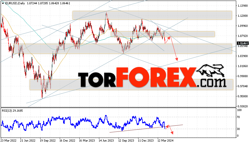 Дополнительным сигналом в пользу снижения валютной пары EUR/USD на Форекс выступит тест линии сопротивления на индикаторе относительной силы (RSI). Вторым сигналом станет отскок от верхней границы медвежьего канала. Отменой варианта падения котировок пары Евро Доллар на текущей торговой неделе 15 — 19 апреля 2024, станет сильный рост и пробой уровня 1.1025. Это укажет на пробой области сопротивления и продолжение роста пары в область выше уровня 1.1385. С пробоем области поддержки и закрытием котировок ниже уровня 1.0505.