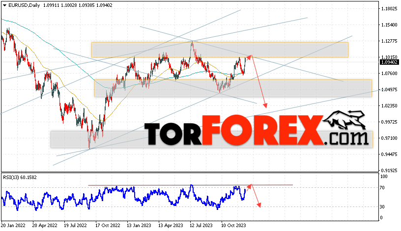 Таким образом, EUR/USD прогноз на неделю 18 — 22 декабря 2023 предполагает попытку развития бычьей коррекции и тест области сопротивления вблизи уровня 1.0965. Откуда стоит ожидать отскок цены вниз и продолжения падения пары на рынке Форекс в область ниже уровня 1.0215. Дополнительным сигналом в пользу снижения выступит тест линии сопротивления на индикаторе относительной силы (RSI). Отменой варианта падения Евро Доллар станет сильный рост и пробой уровня 1.1245. В этом случае стоит ожидать продолжения подъёма пары с потенциальной целью на уровне 1.1435.