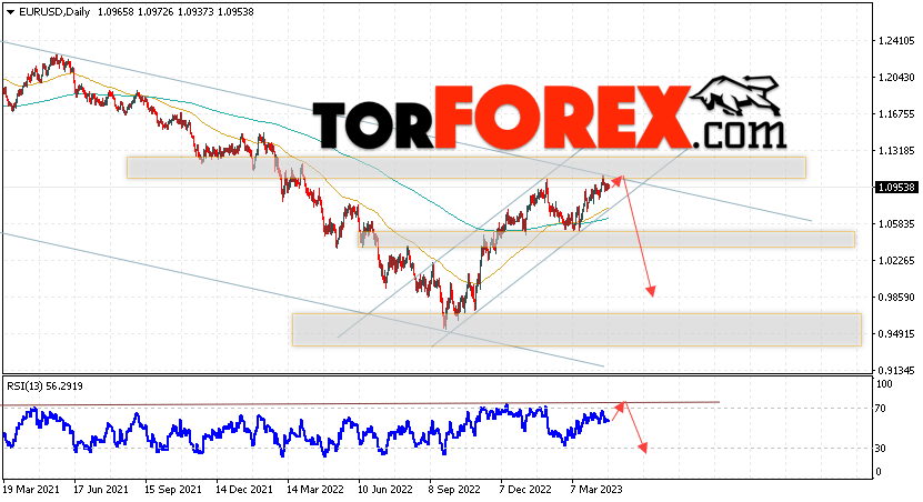 Дополнительным сигналом в пользу снижения валютной пары EUR/USD на Форекс выступит тест линии тренда на индикаторе относительной силы (RSI). Вторым сигналом станет отскок от верхней границы нисходящего канала. Отменой варианта падения котировок пары Евро Доллар на текущей торговой неделе 24 — 28 апреля 2023, станет сильный рост и пробой уровня 1.1375. Это укажет на пробой области сопротивления и продолжение роста пары в область выше уровня 1.1715. С пробоем области поддержки и закрытием котировок ниже уровня 1.0695, что укажет на пробой нижней границы бычьего канала коррекции и начало отработки модели ”Двойная вершина” с целями внизу.