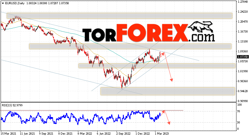 Дополнительным сигналом в пользу снижения валютной пары EUR/USD на Форекс выступит тест линии тренда на индикаторе относительной силы (RSI). Вторым сигналом станет отскок от верхней границы нисходящего канала. Отменой варианта падения котировок пары Евро Доллар на текущей торговой неделе 27 — 31 марта 2023, станет сильный рост и пробой уровня 1.1325. Это укажет на пробой области сопротивления и продолжение роста пары в область выше уровня 1.1675. С пробоем области поддержки и закрытием котировок ниже уровня 1.0205, что укажет на пробой нижней границы очередного бычьего канала и начало отработки модели ”Двойная вершина” с целями внизу.