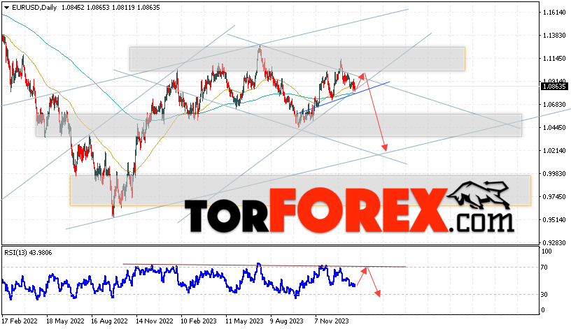 Таким образом, EUR/USD прогноз на неделю 29 января — 2 февраля 2024 предполагает попытку развития бычьей коррекции и тест области сопротивления вблизи уровня 1.0965. Откуда стоит ожидать отскок цены вниз и продолжения падения пары на рынке Форекс в область ниже уровня 1.0215. Дополнительным сигналом в пользу снижения выступит тест линии сопротивления на индикаторе относительной силы (RSI). Отменой варианта падения Евро Доллар станет сильный рост и пробой уровня 1.1265. В этом случае стоит ожидать продолжения подъёма пары с потенциальной целью на уровне 1.1545.