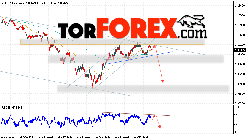 Дополнительным сигналом в пользу снижения валютной пары EUR/USD на Форекс выступит тест линии сопротивления на индикаторе относительной силы (RSI). Вторым сигналом станет отскок от верхней границы медвежьего канала. Отменой варианта падения котировок пары Евро Доллар на текущей торговой неделе 3 — 7 июля 2023, станет сильный рост и пробой уровня 1.1265. Это укажет на пробой области сопротивления и продолжение роста пары в область выше уровня 1.1695. С пробоем области поддержки и закрытием котировок ниже уровня 1.0635, что укажет на пробой нижней границы разворотной модели «Голова и плечи» и начало отработки паттерна с целями внизу.