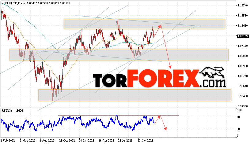 Дополнительным сигналом в пользу снижения валютной пары EUR/USD на Форекс выступит тест линии сопротивления на индикаторе относительной силы (RSI). Вторым сигналом станет отскок от верхней границы медвежьей модели «Двойная вершина». Отменой варианта падения котировок пары Евро Доллар на текущей торговой неделе 8 — 12 января 2024, станет сильный рост и пробой уровня 1.1405. Это укажет на пробой области сопротивления и продолжение роста пары в область выше уровня 1.1795. С пробоем области поддержки и закрытием котировок ниже уровня 1.0685, что укажет на пробой нижней границы разворотной модели «Двойная вершина» и начало отработки паттерна с целями внизу.