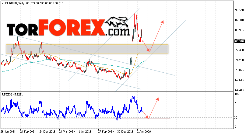 Дополнительным сигналом в пользу роста валютной пары EUR/RUB на текущей торговой неделе выступит тест нижней границы восходящего канала. Вторым сигналом станет отскок от линии поддержки на индикаторе относительной силы. Отменой варианта роста пары EUR/RUB на текущей торговой неделе 27 апреля — 1 мая 2020 станет падение и пробой уровня 74.05 Евро за Рубль. Это укажет на пробой нижней границы канала и ускорение падения пары Евро Рубль в область ниже уровня 70.05. Подтверждением подъёма пары на текущей торговой неделе выступит пробой уровня сопротивления и закрытие выше уровня 82.65.