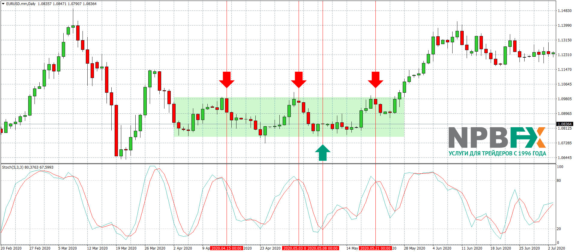 Для теханализа флэта мы использовали осциллятор Stochastic. Сигналами на вход в сделку выступало пересечение линий %K и %D в зонах перекупленности или перепроданности, либо на их границах. Как видно из графика, было три сигнала на продажу и один на покупку, которые позволили заработать прибыль внутри ценового канала.
