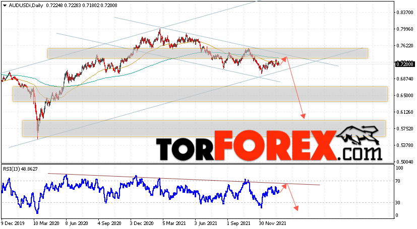 Таким образом, Форекс прогноз AUD/USD на 24 — 28 января 2022 предполагает попытку развития бычьей коррекции и теста уровня 0.7265. Далее, продолжение снижения валютной пары ниже уровня 0.6095. В пользу падения пары на текущий торговой неделе выступит тест линии тренда на индикаторе относительной силы. Отменой варианта снижения станет сильный рост и пробой области 0.7645. Это укажет на пробой области сопротивления и продолжение роста пары с целью выше 0.8305.