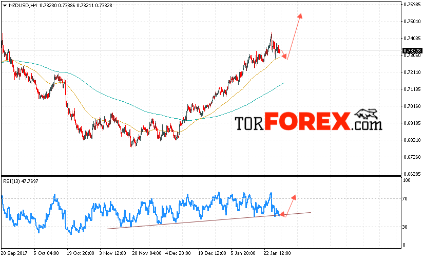 Таким образом, Форекс прогноз и аналитика NZD/USD на 26 января 2018 предполагает попытку теста области поддержки вблизи уровня 0.7315, откуда стоит ожидать продолжения роста котировок в область выше уровня 0.7510, дополнительным сигналом в пользу роста выступит тест линии поддержки на индикаторе относительной силы, отменой варианта роста пары NZD/USD станет падение и пробой уровня 0.7290.