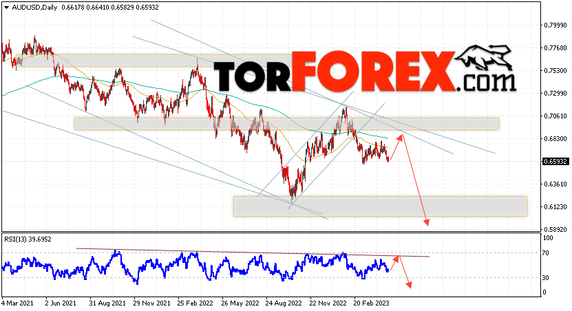 Дополнительным сигналом в пользу падения пары на Форекс выступит отскок от верхней границы нисходящего канала. Вторым сигналом станет отскок от нисходящей линии тренда на индикаторе относительной силы. Отменой варианта падения валютной пары AUD/USD на текущей торговой неделе 1 — 5 мая 2023 станет сильный рост и пробой уровня 0.7075. Это укажет на пробой сопротивления и продолжение подъёма Австралийского Доллара на Форекс с потенциальной целью на уровне 0.7295. Подтверждением развития снижения выступит пробой области поддержки и закрытие цен ниже уровня 0.6565.