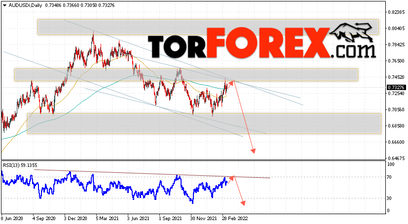 Таким образом, Форекс прогноз AUD/USD на 14 — 18 марта 2022 предполагает попытку развития бычьей коррекции и теста уровня 0.7405. Далее, продолжение снижения валютной пары ниже уровня 0.6495. В пользу падения пары на текущий торговой неделе выступит тест линии тренда на индикаторе относительной силы. Отменой варианта снижения станет сильный рост и пробой области 0.7625. Это укажет на пробой области сопротивления и продолжение роста пары с целью выше 0.8265.