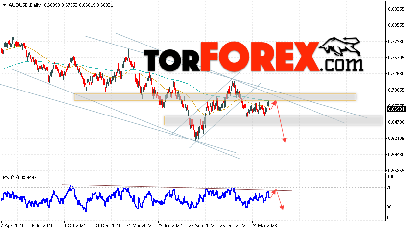 Таким образом, Форекс прогноз AUD/USD на 15 — 19 мая 2023 предполагает попытку развития бычьей коррекции и теста уровня 0.6735. Далее, продолжение снижения валютной пары ниже уровня 0.6655. В пользу падения пары на текущий торговой неделе выступит тест линии тренда на индикаторе относительной силы. Отменой варианта снижения станет сильный рост и пробой области 0.7045. Это укажет на пробой области сопротивления и продолжение роста пары с целью выше 0.7275.