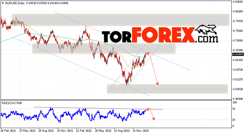 Таким образом, Форекс прогноз AUD/USD на 16 — 20 января 2023 предполагает попытку развития бычьей коррекции и теста уровня 0.6995. Далее, продолжение снижения валютной пары ниже уровня 0.6135. В пользу падения пары на текущий торговой неделе выступит тест линии тренда на индикаторе относительной силы. Отменой варианта снижения станет сильный рост и пробой области 0.7205. Это укажет на пробой области сопротивления и продолжение роста пары с целью выше 0.7485.