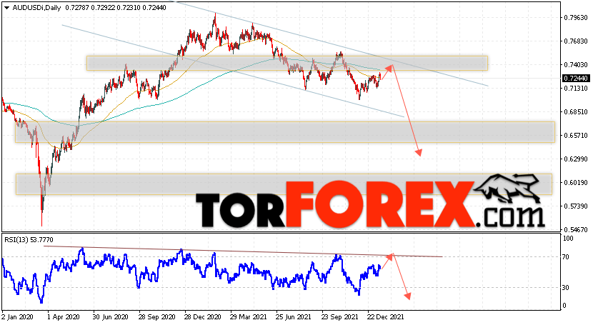 Дополнительным сигналом в пользу падения пары на Форекс выступит отскок от верхней границы нисходящего канала. Вторым сигналом станет отскок от нисходящей линии тренда на индикаторе относительной силы. Отменой варианта падения валютной пары AUD/USD на текущей торговой неделе 17 — 21 января 2022 станет сильный рост и пробой уровня 0.7625. Это укажет на пробой сопротивления и продолжение подъёма Австралийского Доллара на Форекс с потенциальной целью на уровне 0.8245. Подтверждением развития снижения выступит пробой области поддержки и закрытие цен ниже уровня 0.6845.