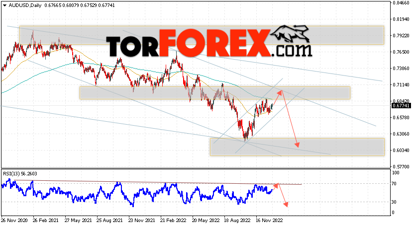 Дополнительным сигналом в пользу падения пары на Форекс выступит отскок от верхней границы нисходящего канала. Вторым сигналом станет отскок от нисходящей линии тренда на индикаторе относительной силы. Отменой варианта падения валютной пары AUD/USD на текущей торговой неделе 2 — 6 января 2023 станет сильный рост и пробой уровня 0.7165. Это укажет на пробой сопротивления и продолжение подъёма Австралийского Доллара на Форекс с потенциальной целью на уровне 0.7535. Подтверждением развития снижения выступит пробой области поддержки и закрытие цен ниже уровня 0.6535, что укажет на пробой нижней границы бычьего канала коррекции.
