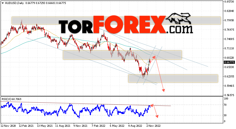 Дополнительным сигналом в пользу падения пары на Форекс выступит отскок от верхней границы нисходящего канала. Вторым сигналом станет отскок от нисходящей линии тренда на индикаторе относительной силы, как видим, уже было несколько отскоков от этой линии, скорее всего и текущий тест не станет исключением и мы увидим сильное падение пары уже на текущей торговой неделе. Отменой варианта падения валютной пары AUD/USD на текущей торговой неделе 21 — 25 ноября 2022 станет сильный рост и пробой уровня 0.7165. Это укажет на пробой сопротивления и продолжение подъёма Австралийского Доллара на Форекс с потенциальной целью на уровне 0.7495. Подтверждением развития снижения выступит пробой области поддержки и закрытие цен ниже уровня 0.6495, что укажет на пробой нижней границы бычьего канала коррекции.