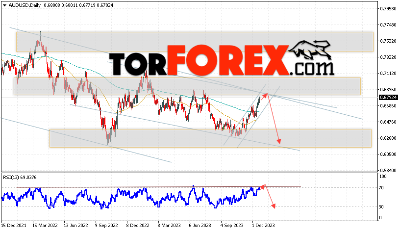 Дополнительным сигналом в пользу падения пары на Форекс выступит отскок от верхней границы медвежьего канала. Вторым сигналом станет отскок от нисходящей линии тренда на индикаторе относительной силы. Отменой варианта падения валютной пары AUD/USD на текущей торговой неделе 25 — 29 декабря 2023 станет сильный рост и пробой уровня 0.6945. Это укажет на пробой сопротивления и продолжение подъёма Австралийского Доллара на Форекс с потенциальной целью на уровне 0.7285. Подтверждением развития снижения выступит пробой области поддержки и закрытие цен ниже уровня 0.6485, что укажет на пробой нижней границы бычьего канала коррекции.