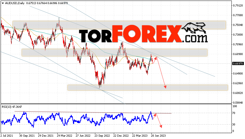 Дополнительным сигналом в пользу падения пары на Форекс выступит отскок от верхней границы нисходящего канала. Вторым сигналом станет отскок от нисходящей линии тренда на индикаторе относительной силы. Отменой варианта падения валютной пары AUD/USD на текущей торговой неделе 26 — 30 июня 2023 станет сильный рост и пробой уровня 0.7045. Это укажет на пробой сопротивления и продолжение подъёма Австралийского Доллара на Форекс с потенциальной целью на уровне 0.7345. Подтверждением развития снижения выступит пробой области поддержки и закрытие цен ниже уровня 0.6475.