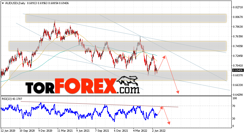 Дополнительным сигналом в пользу падения пары на Форекс выступит отскок от верхней границы медвежьего канала. Вторым сигналом станет отскок от нисходящей линии тренда на индикаторе относительной силы. Отменой варианта падения валютной пары AUD/USD на текущей торговой неделе 27 июня — 1 июля 2022 станет сильный рост и пробой уровня 0.7705. Это укажет на пробой сопротивления и продолжение подъёма Австралийского Доллара на Форекс с потенциальной целью на уровне 0.8275. Подтверждением развития снижения выступит пробой области поддержки и закрытие цен ниже уровня 0.6605, что укажет на пробой нижней границы нисходящего канала.