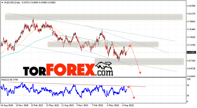 Дополнительным сигналом в пользу падения пары на Форекс выступит отскок от верхней границы нисходящего канала. Вторым сигналом станет отскок от нисходящей линии тренда на индикаторе относительной силы. Отменой варианта падения валютной пары AUD/USD на текущей торговой неделе 29 августа — 2 сентября 2022 станет сильный рост и пробой уровня 0.7435. Это укажет на пробой сопротивления и продолжение подъёма Австралийского Доллара на Форекс с потенциальной целью на уровне 0.7645. Подтверждением развития снижения выступит пробой области поддержки и закрытие цен ниже уровня 0.6455, что укажет на пробой нижней границы нисходящего канала.