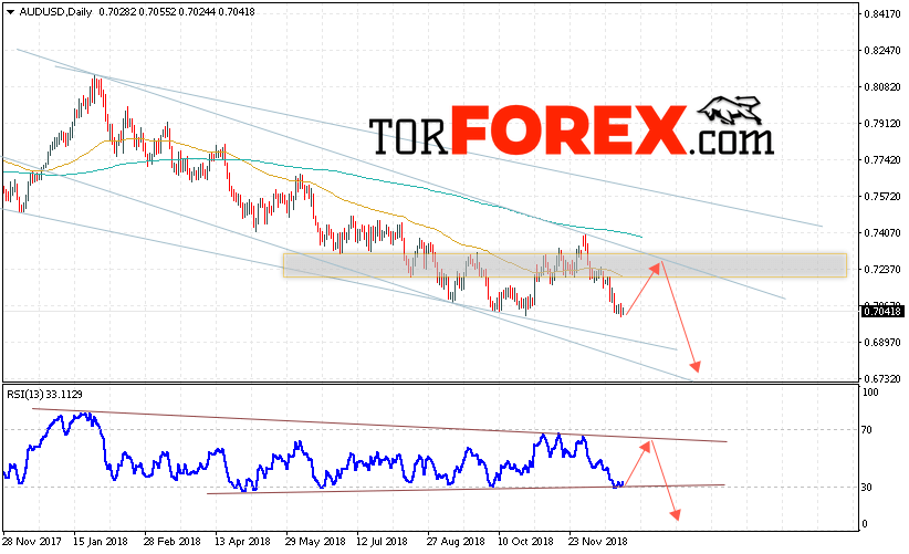Таким образом, Форекс прогноз AUD/USD на 31 декабря — 4 января 2019 предполагает попытку теста уровня 0.7240. Далее продолжение падения ниже уровня 0.6735. В пользу снижения пары выступит тест линии тренда на индикаторе относительной силы. Отменой варианта падения станет сильный рост и пробой области 0.7320. Это укажет на пробой области сопротивления и продолжение роста пары.